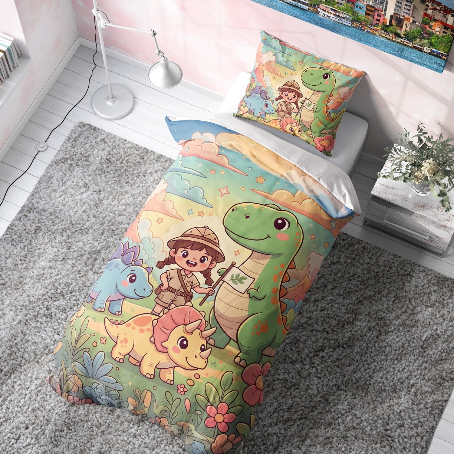 Macera dolu dinozor dünyasını çocuk odalarına taşıyan bu çocuk yorgan, renkli ve enerjik tasarımıyla dikkat çeker.
