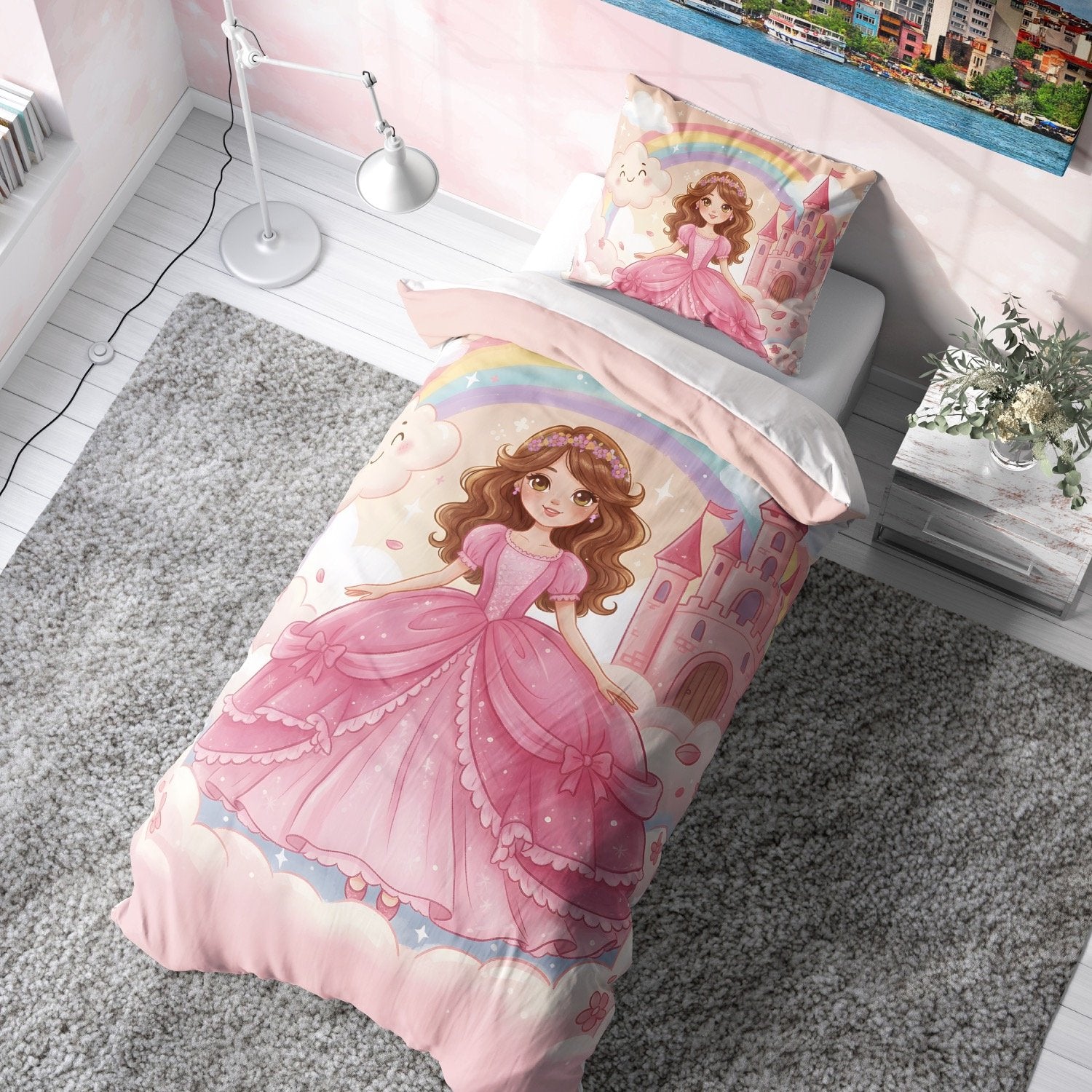 Sevimli prenses ve gökkuşağı figürleriyle tasarlanan bu çocuk yorgan, odalara neşe ve sıcaklık katar.