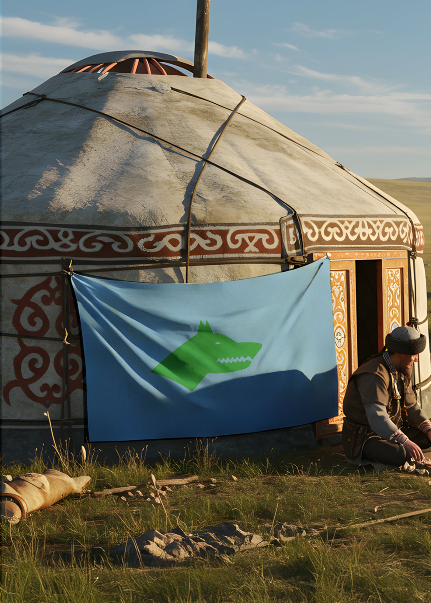 Göktürk bayrağından ilham alınarak tasarlanan bu duvar örtüsü, Türk tarihinin en eski ve güçlü sembollerinden biri olan bozkurt figürünü sade bir anlatımla ön plana çıkarır. Göktürk Devleti’nin bağımsızlık ve devlet geleneğini simgeleyen bu tasarım, Türk kültürü ve mitolojisinden esinlenen dekoratif bir sanat çalışmasıdır.