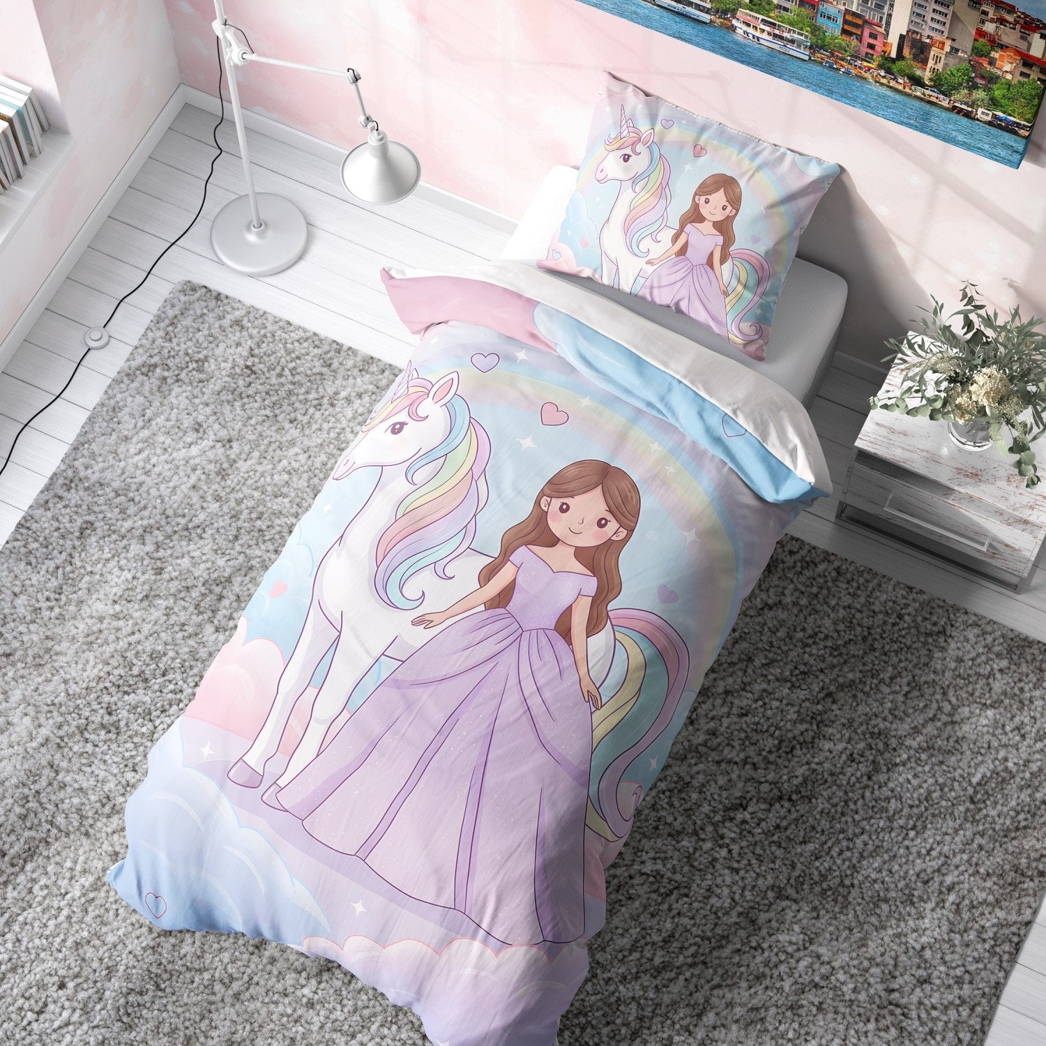 Pastel tonlarda hazırlanmış bu çocuk yorgan, prenses ve unicorn temasını zarif bir şekilde birleştirir.