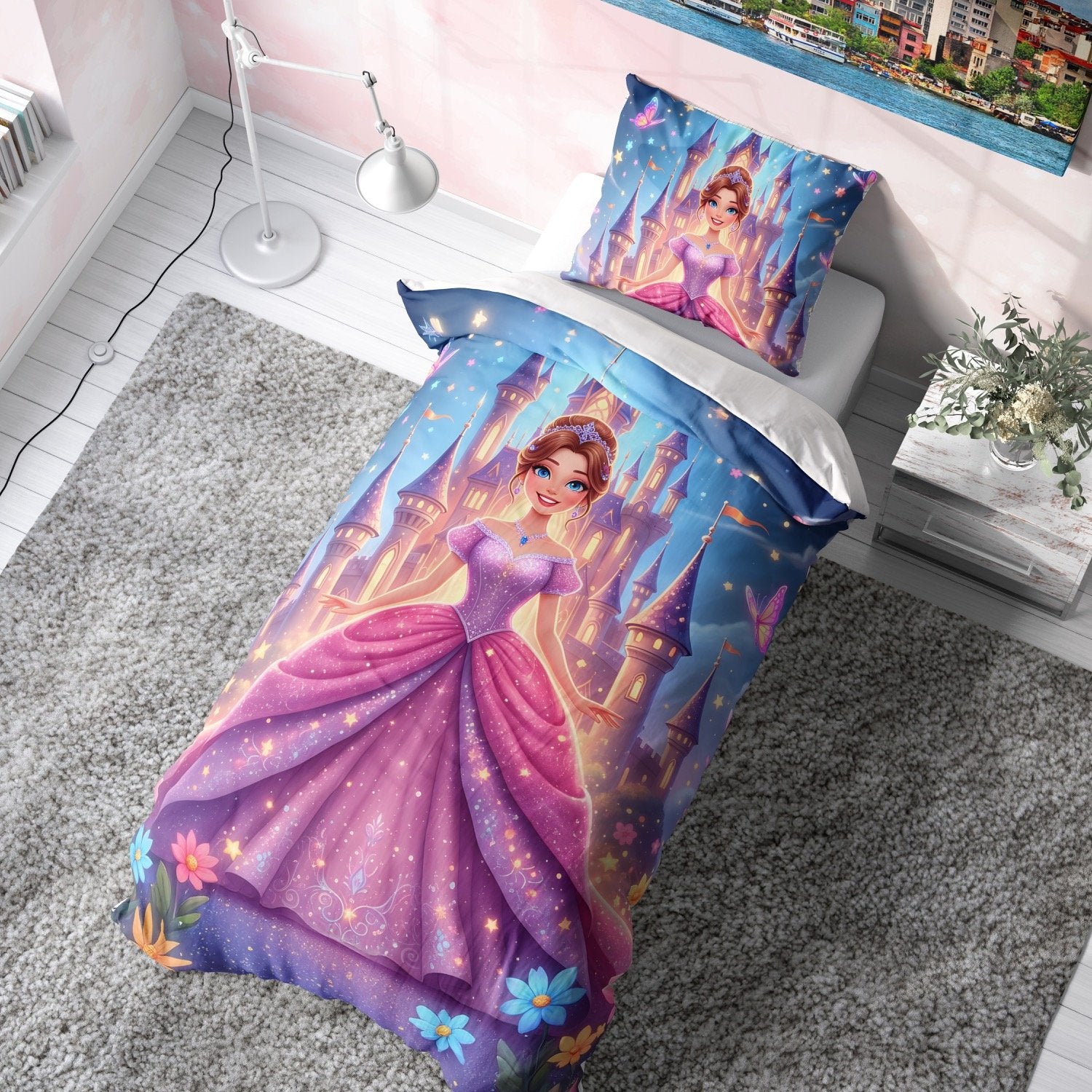 Işıltılı mor elbisesiyle büyüleyici bir prensesin şatosu önünde tasarlandığı bu çocuk yorgan, küçük kızların hayal dünyasını renklendirir.